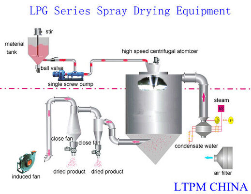 Ο αέρας είναι μέσω του φίλτρου και της θερμάστρας, ο διανομέας αέρα που εισάγει την κορυφή dedicator, ο ζεστός αέρας λαμβάνει τη μορφή σπείρας και εισάγει το dedicator ομοιόμορφα. Το υλικό υγρό, από την υλική υγρή γούρνα από το σε διαφωνία με την κοινότητα ή τον ψεκαστήρα ηγεσίας για την κορυφή dedicator της αντλίας που στέλνει μέσω του φίλτρου, κάνει την υλική υγρή ανάβλυση έξω σε μια εξαιρετικά μικρή θερμαντική πτώση, το υλικοί υγρό και ο ζεστός αέρας ρέουν και διατηρούν επαφή, η υγρασία εξατμίζει γρήγορα, μέσα εξαιρετικά στο λίγος χρόνο ξηρό για να γίνει ολοκληρωμένο προϊόν, απαλλαγή ολοκληρωμένων προϊόντων από το ξηρό κατώτατο σημείο πύργων και whirlwind διαχωριστής, το αέριο αποβλήτων απαλλάσσεται από τον ανεμιστήρα αέρα.